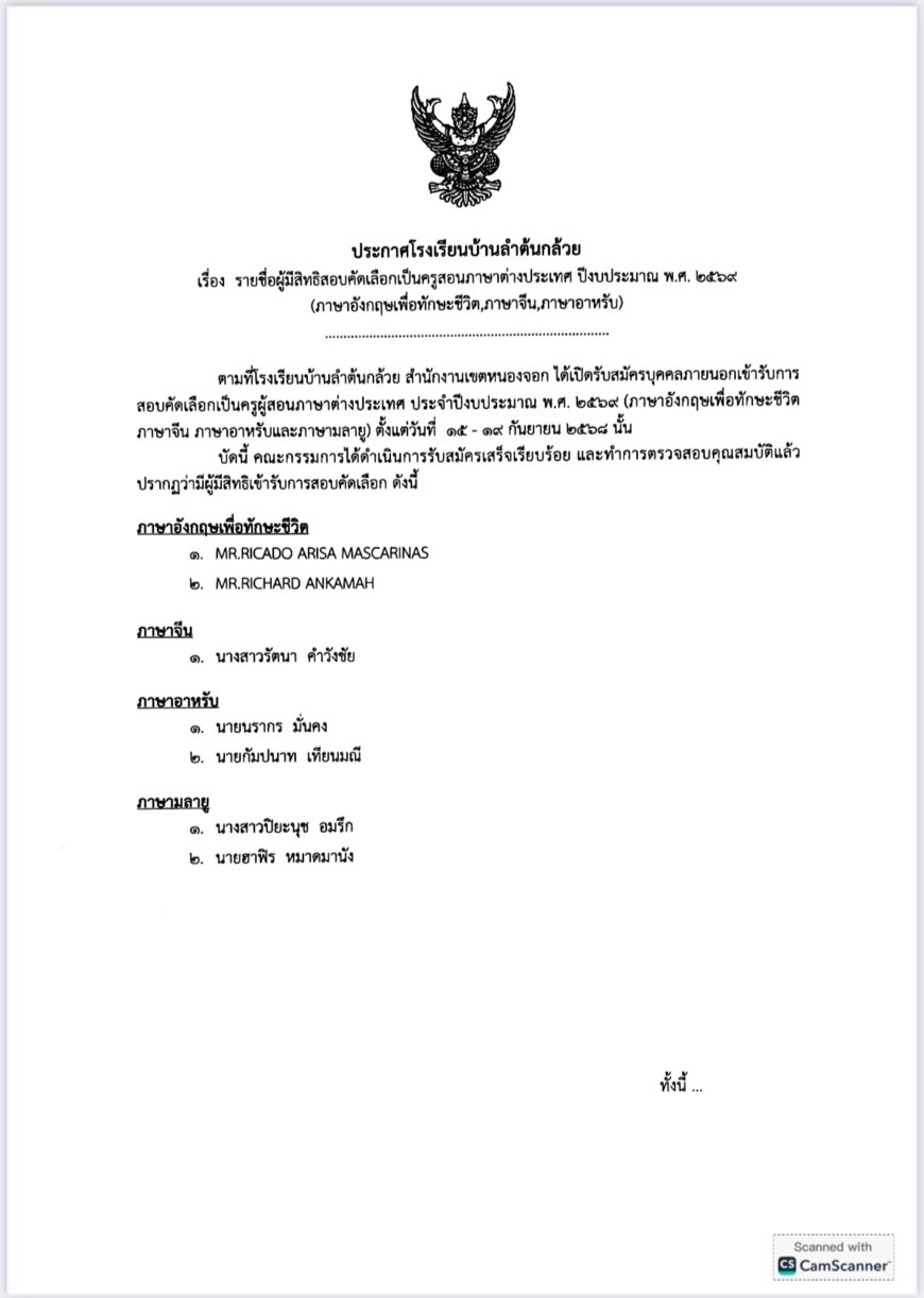 ประกาศรายชื่อผู้มีสิทธิ์สอบคัดเลือกสอนภาษาต่างประเทศ ประจำปีงบประมาณ พ.ศ.2569