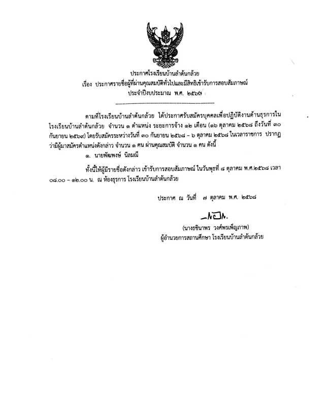 ประกาศรายชื่อผู้ผ่านคุณสมบัติทั่วไปและมีสิทธิเข้ารับการสัมภาษณ์ เพื่อปฏิบัติงานด้านธุรการ